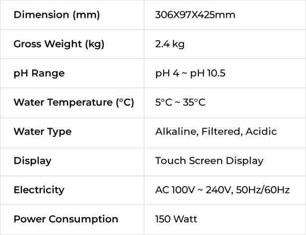 Solenoid type (DARC system) technology with the patent in 6 countries worldwide. Water cell in order to make the best alkaline water with 5 electrode plates.
